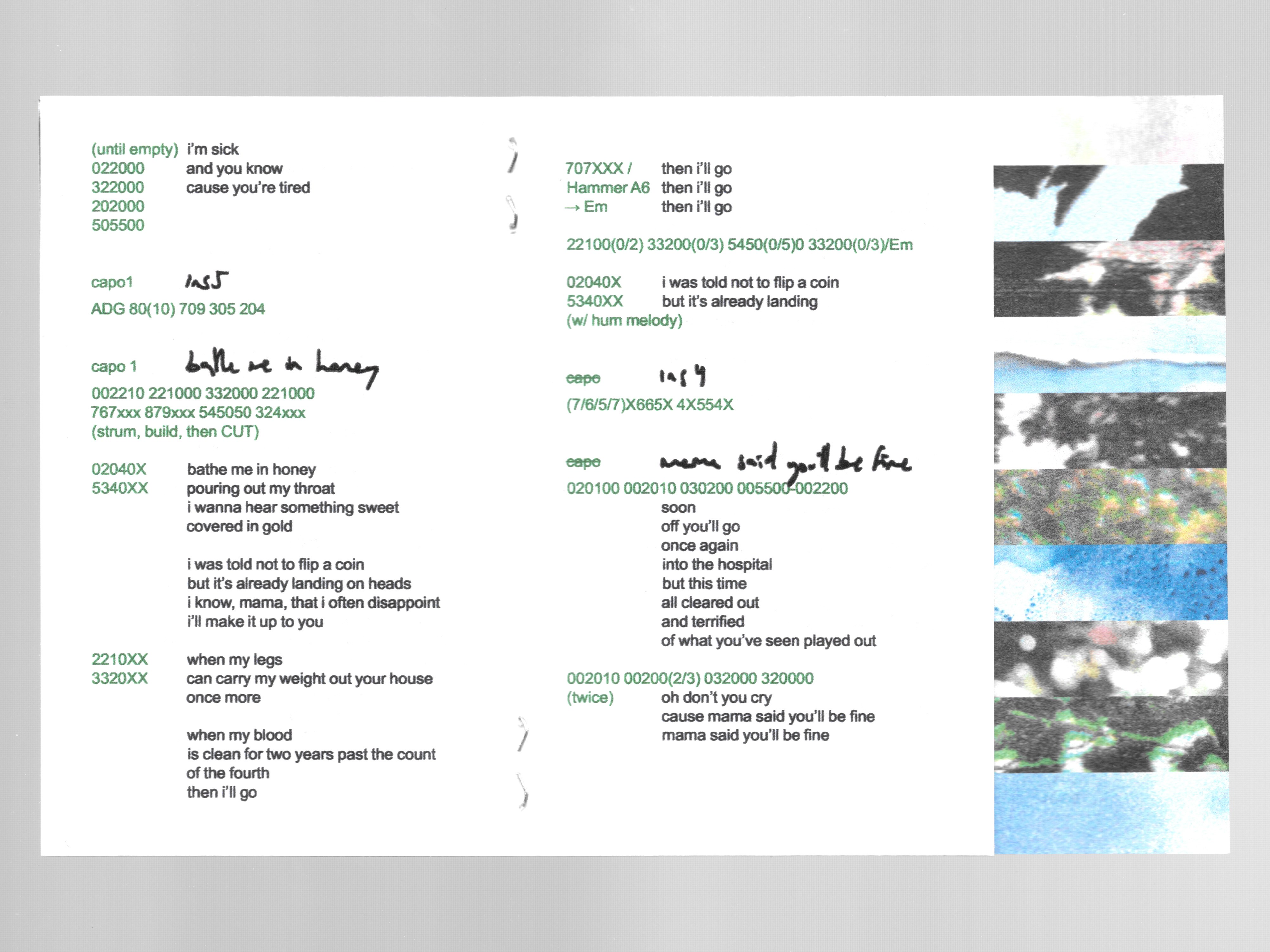 Each song is accompanied by an animation made by printing and rescanning frames, manipulated by way of water- and alcohol-based ink displacement, tearing, and toner cartridge failure.